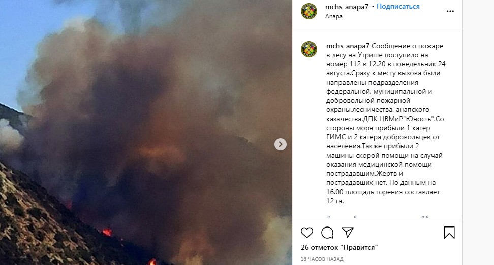 "По состоянию на 06.40 мск в муниципальном образовании Анапа площадь активного горения около 3 га. Проведена эвакуация отдыхающих, за ночь эвакуировали с Малого Утриша 350 человек", - цитирует сегодня сообщение ведомства ТАСС.
