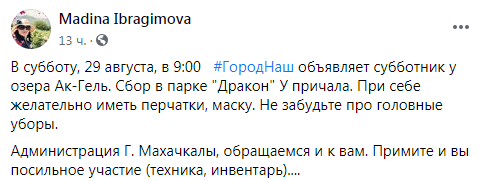 Активисты  #ГородНаш объявили о проведении субботника у озера Ак-Гель 29 августа. "Сбор в парке "Дракон" у причала. При себе желательно иметь перчатки, маску. Не забудьте про головные уборы", - говорится в сообщении на странице движения в Facebook. Они также обратились в администрации Махачкалы. "Примите и вы посильное участие (техника, инвентарь)", - написала пользователь Madina Ibragimova.