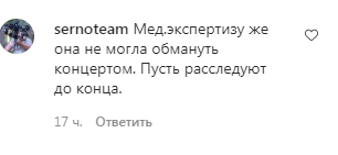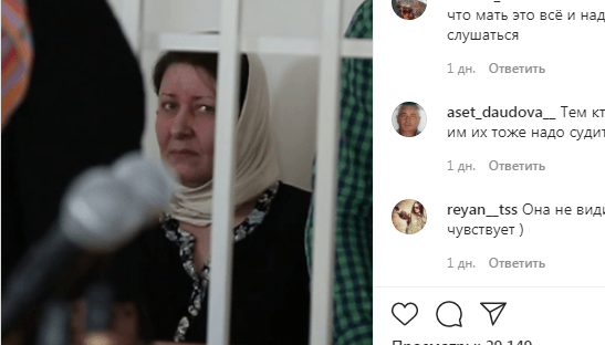 "Медэкспертизу же она не могла обмануть концертом. Пусть расследуют до конца", - написал пользователь sernoteam, комментируя видеоролик о приговоре Исаковой и ее сыну, размещенный в сообществе chechnyatoday_95 в Instagram, насчитывающем 290 тысяч подписчиков. По данным на 00.40 мск 26 сентября его посмотрели 29 086 раз, пользователи оставили под ним 60 комментариев.