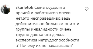 "Сына осудили, а врачей... нет. Это несправедливо. Ведь действительно больным они эти группы инвалидности очень трудно дают. А что делала экспертиза нетрудоспособности? Почему их не наказывают?" - поддержал ее skarletok.