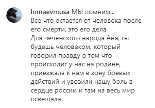 "Все, что остается от человека после его смерти, это его дела. Для чеченского народа, Аня, ты будешь человеком, который говорил правду о том, что происходит у нас на родине. Приезжала к нам в зону боевых действий, увозила нашу боль в сердце России и там на весь мир освещала. Аня еще в самом начале, когда никто не знал о Рамзане Кадырове, четко и ёмко определила его сущность [...] Огромная благодарность тебе за все, что ты сделала для чеченского народа, для меня и моей семьи", - написал 7 октября на своей странице в Instagram пользователь lomaevmusa.