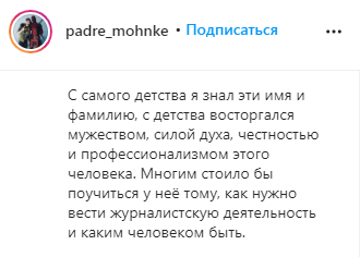 "С самого детства я знал эти имя и фамилию, с детства восторгался мужеством, силой духа, честностью и профессионализмом этого человека. Многим стоило бы поучиться у неё тому, как нужно вести журналистскую деятельность, и каким человеком быть", - написал пользователь padre_mohnke на своей странице в Instagram. "Мне горько осознавать, что такие невероятные люди гибнут, потому что кому-то неудобны. Верю и надеюсь, что всем причастным к этой трагедии когда-нибудь воздастся по заслугам, и все их деяния вернутся к ним бумерангом", - отметил он.