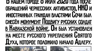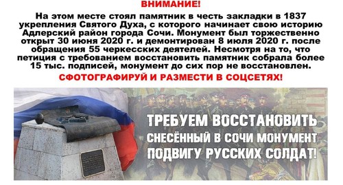 В петиции говорится, что 8 июля 2020 года по решению мэрии города Сочи в Адлере демонтировали памятник русским солдатам, основавшим здесь в 1837 году Форпост Святого Духа. Демонтаж памятника был проведён под давлением черкесской диаспоры, и его официальным поводом было отсутствие согласования с администрацией и городским собранием города Сочи, сказано в петиции.