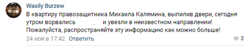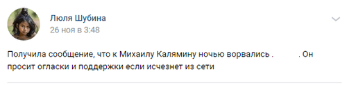 "Получила сообщение, что к Михаилу Калямину ночью ворвались [силовики]. Он просит огласки и поддержки, если исчезнет из сети", - написала 26 ноября на странице пользователь Люля Шубина.