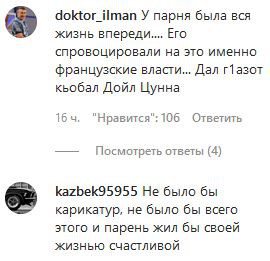 "Ребёнку жить и жить, но французские власти и их политика толкнули его на это!" – написал, в частности, z_shopping95. "У парня была вся жизнь впереди.... Его спровоцировали на это именно французские власти", - заявил doktor_ilman. "Не было бы карикатур, не было бы всего этого, и парень жил бы своей жизнью счастливой", - согласился kazbek95955.