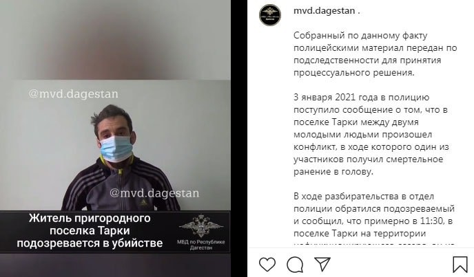 3 января поступило сообщение о том, что в поселке Тарки между двумя молодыми людьми произошел конфликт, в ходе которого один из них скончался после ранения из огнестрельного оружия. В полицию обратился подозреваемый, который рассказал об обстоятельствах произошедшего, следует из сообщения, размещенного сегодня на странице управления МВД по Дагестану в Instagram. Отметим, что имя убитого не называется, однако время и обстоятельства соответствуют данным об убийстве Абдурагимова.