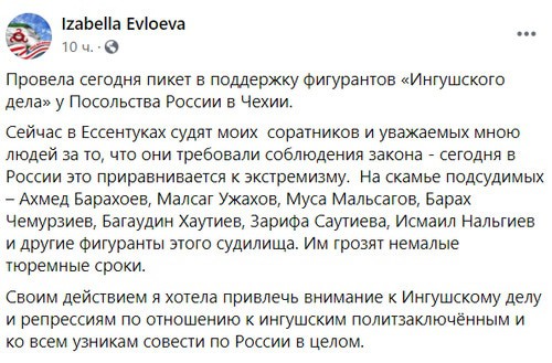 "Сейчас в Ессентуках судят моих соратников и уважаемых мною людей за то, что они требовали соблюдения закона [...] Своим действием я хотела привлечь внимание к ингушскому делу и репрессиям по отношению к ингушским политзаключённым и ко всем узникам совести по России в целом", - написала она на своей странице в Facebook.