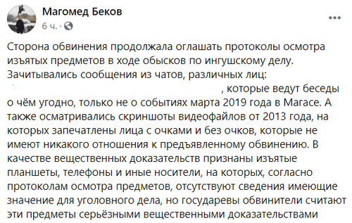 "Сторона обвинения продолжала оглашать протоколы осмотра изъятых предметов в ходе обысков по ингушскому делу. Зачитывались сообщения из чатов, различных лиц [...] которые ведут беседы о чём угодно, только не о событиях марта 2019 года в Магасе. А также осматривались скриншоты видеофайлов от 2013 года, на которых запечатлены лица с очками и без очков, которые не имеют никакого отношения к предъявленному обвинению. В качестве вещественных доказательств признаны изъятые планшеты, телефоны и иные носители, на которых, согласно протоколам осмотра предметов, отсутствуют сведения, имеющие значение для уголовного дела, но государевы обвинители считают эти предметы серьёзными вещественными доказательствами", - написал 16 февраля на своей странице в Facebook адвокат Магомед Беков.