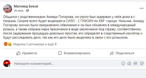 О задержании Ахмеда Погорова сообщил сегодня адвокат Магомед Беков. "Общался с родственниками Ахмеда Погорова, он утром был задержан у себя дома в Назрани. Скорее всего будет водворен в СИЗО-1 ГУФСИН по Кабардино-Балкарии в городе Нальчик. Ахмеду Погорову заочно было предъявлено обвинение и он был объявлен в международный розыск, а также избрана мера пресечения в виде заключения под стражу, соответственно, после задержания процедура довольно простая, его определят в следственный изолятор и будут расследовать дело, так как его дело было выделено в связи с его розыском", – написал Беков сегодня на своей странице в Facebook.