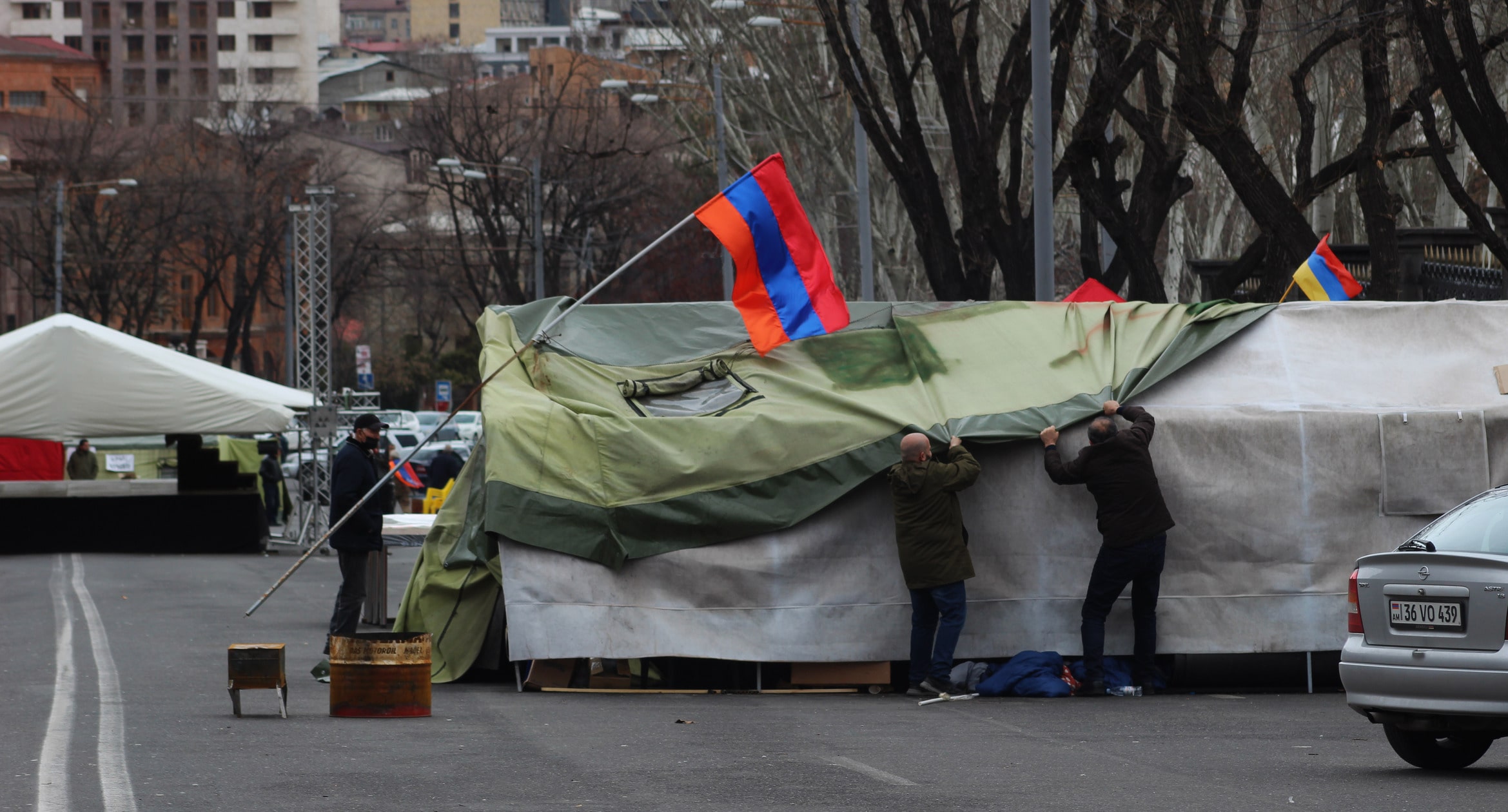 Участники акции удерживают палатку, чтобы не унес ветер. Ереван, 12 марта 2021 г. Фото Тиграна Петросяна для "Кавказского узла"Пашинян идет на необоснованные территориальные уступки, и его политика ставит под угрозу армянскую государственность, считает сторонник оппозиции. "В [трехстороннем заявлении], в частности, нет ни одного упоминания о Сюнике, но мы видим, как Пашинян уступает Азербайджану сюникские земли. И нет гарантий, что завтра аналогичное не произойдет в Тавуше. Пашинян не в состоянии защищать национальные интересы", - отметил Лазарян.