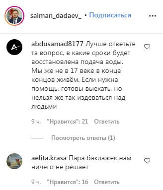 Также запись о подвозе воды жителям Махачкалы была размещена 16 марта и на странице Instagram-паблика lifedagestan, на который подписаны около 763 тысяч пользователей. К 07.40 мск 17 марта эта запись набрала 3839 отметок "нравится" и 162 комментария. Большинство их авторов пожаловались на рост социальных проблем в Махачкале.