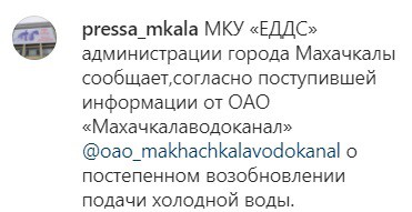 "МКУ "ЕДДС" администрации города Махачкалы сообщает... о постепенном возобновлении подачи холодной воды. Убедительная просьба при восстановлении подачи водоснабжения в течении трёх суток использовать для питья только кипячённую воду", – говорится в сообщении на официальной странице администрации Махачкалы pressa_mkala в Instagram, насчитывающей 80,4 тысячи подписчиков.