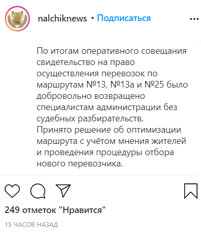 По данным на 09.00 мск сегодня пользователи оставили под сообщением 251 отметку нравится и 84 комментария. Большинство пользователей посетовали на невозможность добраться общественным транспортом в Нальчик, указав, что маршруты были востребованными.