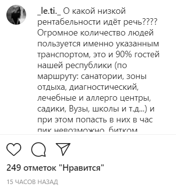 "О какой низкой рентабельности идёт речь???? Огромное количество людей пользуется именно указанным транспортом, это и 90 процентов гостей нашей республики (по маршруту: санатории, зоны отдыха, диагностический, лечебные и аллергоцентры, садики, вузы, школы и т.д.), и при этом попасть в них в час пик невозможно, битком забитые, перевозящие не 13 человек, а по 30-40 человек.... Но то, что мы наблюдали 26-го числа, было бесчеловечно. Вопросы, уважаемые, так не решаются!!!" - высказалась _le.ti._.