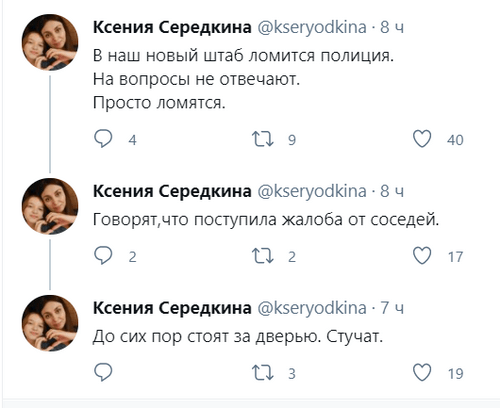 "В наш новый штаб ломится полиция. На вопросы не отвечают", - написала она около 2.50 мск в своем Twitter.