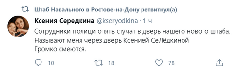 "Сотрудники полиции опять стучат в дверь нашего нового штаба. Называют меня через дверь Ксенией СеЛёдкиной. Громко смеются", - написала она в 9.30 мск на странице штаба Навального в Ростове-на-Дону в Twitter.