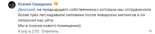 Мы в поиске нового помещения", - написала она на своей странице "ВКонтакте" 8 апреля, отвечая на вопрос пользователя о том, почему в прежнем помещении штаба располагается другая организация.