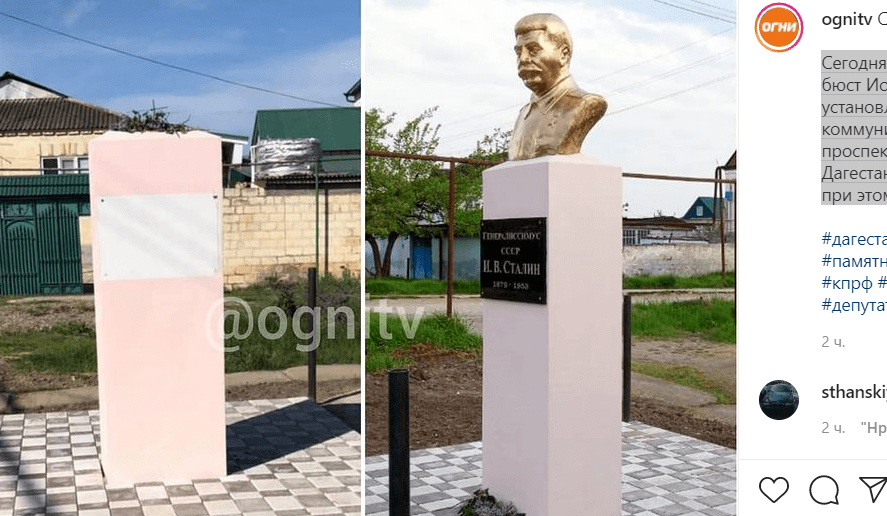 Бюст Сталина, установленный 29 апреля в Дагестанских Огнях, убран с постамента вместе с табличкой.