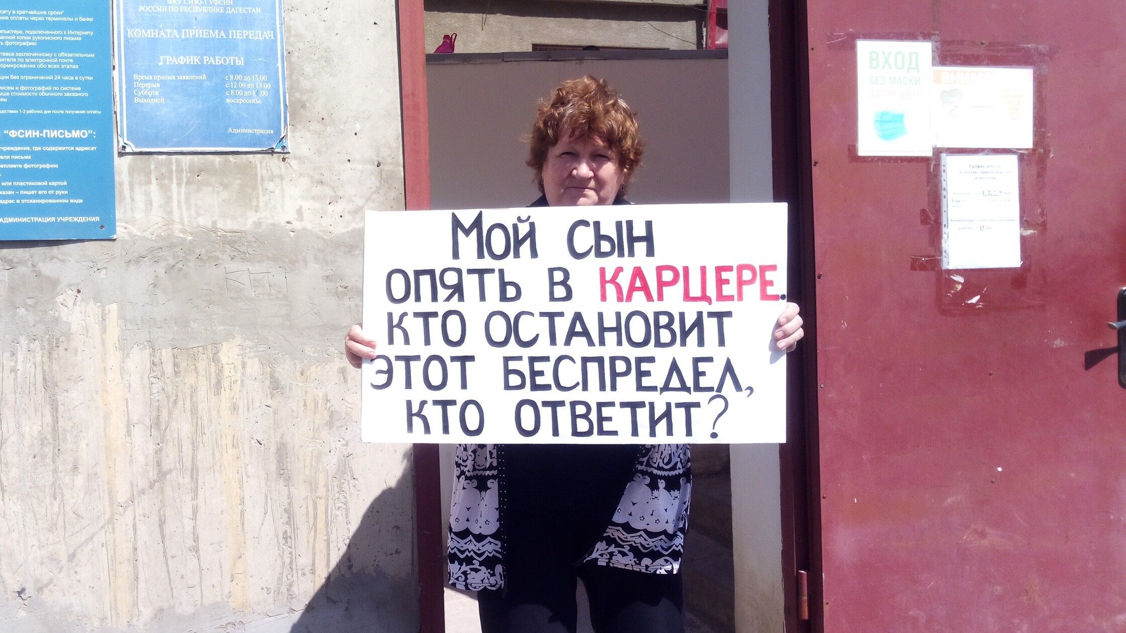 Елена Барзукаева приехала сегодня из Дербента в Махачкалу и около 10.00 мск начала одиночный пикет с плакатом: "Мой сын опять в карцере. Кто остановит этот беспредел. Кто ответит?". Она встала прямо у входа в СИЗО в Махачкале.