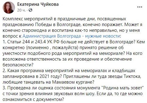 "Комплекс мероприятий в праздничные дни, посвященных празднованию Победы в Волгограде, конечно поражает", - написала она и задала вопросы к администрации Волгограда. "Кем конкретно (поименно, пожалуйста) принято решение об уместности подобного рода мероприятий на мемориале? На кого возложена ответственность за их проведение и обеспечение безопасности?" - написала она.