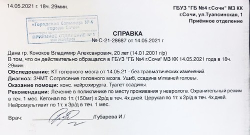 Нарушителей порядка никто не задерживал, отметил он. Полиция общалась с ними вежливо и уважительно, как со старыми и хорошими знакомыми, а студента сразу арестовали и продержали с окровавленной головой до вечера. После того как его выпустили из участкового пункта, активист сразу же поехал в больницу, так как очень плохо себя чувствовал. "Меня тошнило. Событие было в полдень, а я смог добраться до городской больницы после удержания в полиции только к вечеру. Мне в травмпункте оказали помощь: промыли рану в голове, дали обезболивающее, провели МРТ. Был поставлен диагноз "закрытая черепно-мозговая травма", рекомендовано лечение в поликлинике по месту жительства, покой и прием лекарств. Я до сих пор лечусь в поликлинике. Появились сильные головные боли", - рассказал студент. Он предъявил справку из травмпункта, датированную 14 мая, и выданную в 18.29 врачом горбольницы № 4 И. Губаревым, указавшем в диагнозе закрытую черепно-мозговую травму, сотрясение мозга, ушиб и ссадину мягких тканей головы.