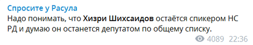 Хизри Шихсаидов остается спикером Народного собрания Дагестана, написал сегодня в своем Telegram-канале "Спросите у Расула" Расул Асад: "Думаю, он останется депутатом по общему списку".