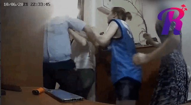 Потасовка при входе в махачкалинский шелтер 10 июня 2021 года. Стоп-кадр видео https://t.me/readovkanews/20297Девушка приоткрывает дверь, не сходя с порога и не впуская никого внутрь. Женщина, просившая открыть дверь, тоже подходит к порогу. О чем они говорят с людьми в подъезде, не слышно, но вскоре девушку начинают тянуть наружу, и поднимается громкий женский крик. На помощь прибегают еще три девушки. Они стоят в дверях и не пускают никого внутрь. Происходит потасовка, в ходе всех, за исключением одной девушки, вытягивают в подъезд. Один из участников потасовки одет в форменную голубую рубашку. После потасовки в квартиру заходит мужчина в гражданской одежде, он сразу выключает камеру, которая и запечатлела произошедшее.