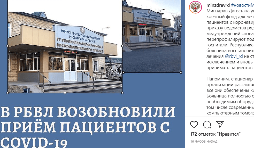 В Республиканской больнице восстановительного лечения организовано 240 коек для зараженных коронавирусом, общее число ковидных коек в Дагестане достигло 3000. Глава Минздрава Дагестана поручила использовать санавиацию и телемедицину при оказании помощи пациентам.