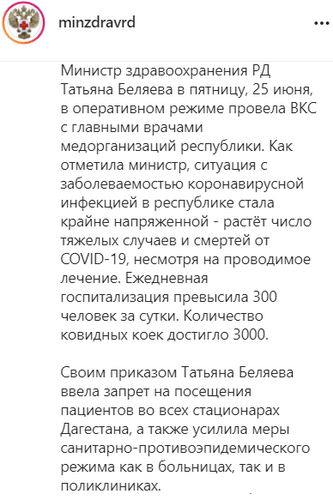По данным Минздрава Дагестана, ежедневная госпитализация пациентов с симптомами коронавируса превысила 300 человек в сутки, общее количество ковидных коек достигло 3000. Введен запрет на посещения пациентов во всех стационарах Дагестана, усилены санитарные меры, как в больницах, так и в поликлиниках, говорится в сообщении на странице ведомства minzdravrd в Instagram. Глава ведомства Татьяна Беляева также поручила в районах проводить КТ-исследования легких в круглосуточном режиме и привлекать санавиацию и телемедицину при лечении зараженных.