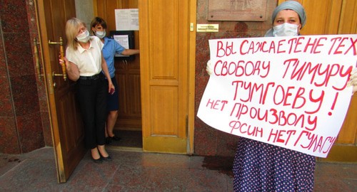 Как писал "Кавказский узел", сегодня в полдень в Саратове сестра Тимура Тумгоева вышла на одиночный пикет с требованием к Следкому и прокуратуре принять меры в защиту брата, который жалуется на условия в колонии. Женщина демонстрировала несколько плакатов, в том числе: "Вы сажаете не тех. Свободу Тимуру Тумгоеву! Нет произволу <...> Нет ГУЛАГу!". Она пояснила, что приехала в Саратов из Северной Осетии, чтобы выяснить судьбу брата, от которого давно не имеет вестей. На пикет обратили внимание сотрудники прокуратуры, по предложению которых Марина Тумгоева написала жалобу на имя областного прокурора.