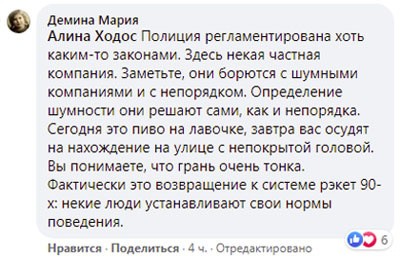 "Полиция регламентирована хоть каким-то законами. Здесь некая частная компания. Заметьте, они борются с шумными компаниями и с непорядком. Определение шумности они решают сами, как и непорядка. Сегодня это пиво на лавочке, завтра вас осудят на нахождение на улице с непокрытой головой. Вы понимаете, что грань очень тонка. Фактически это возвращение к системе рэкет 90-х: некие люди устанавливают свои нормы поведения", – ответила ей Демина Мария.