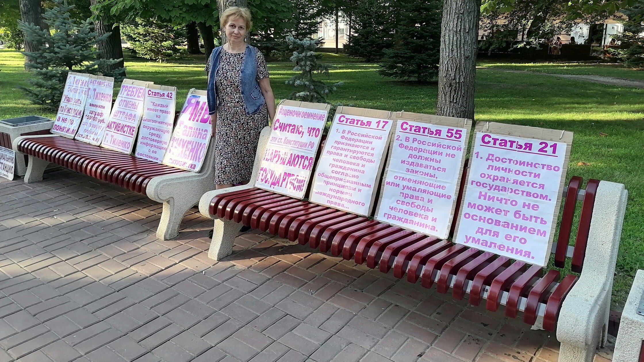 Плакат в защиту Тихенко. Волгоград, 31 июля 2021 года. Фото Татьяны Филимоновой для "Кавказского узла".Четыре одиночных пикета прошли сегодня в центре Волгограда на аллее Героев. Тамара Гродникова разложила на лавочках плакаты с требованием соблюдения статей Конституции и отмены штрафа активистке Галине Тихенко, с которой суд постановил взыскать 150 тысяч рублей.
