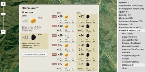 Сотрудник гидрометцентра в Степанакерте сообщил корреспонденту "Кавказского узла", что 11 августа температура воздуха была более +34 градусов, а 9 августа воздух прогрелся до +36 градусов. За все лето осадки были несколько раз, но незначительные - в частности, 2 августа выпало 0,2 миллиметра осадков. По словам сотрудника центра, в ближайшие дни осадков не ожидается. Сегодня этот прогноз подтверждается данными погодного сервиса "Кавказского узла", согласно которому в Степанакерте ясная погода без осадков, температура воздуха +28 градусов, а скорость ветра – три метра в секунду. В ночь на 13 августа осадков также не ожидается, температура воздуха понизится до +22 градусов, скорость ветра снизится до двух метров в секунду. Погодный сервис – это партнерский проект "Кавказского узла" и Gismeteo. На сервисе есть возможность корректировать данные метеорологов для более точного прогноза. Также он доступен в легкой версии и приложениях "Кавказского узла" для Android и AndroidGO.