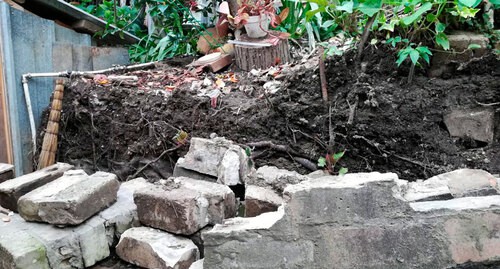 Барак, расположенный по улице Сухумское шоссе, 20, очень ветхий. К нему близко подошел оползень, он накренил опорную стену, которая теперь находится в нескольких сантиметрах от газовой колонки.