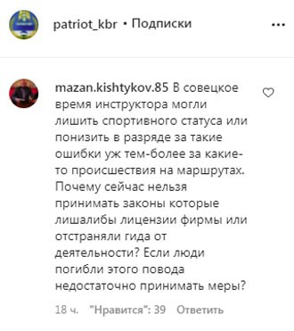"В советское время инструктора могли лишить спортивного статуса или понизить в разряде за такие ошибки и уж тем более за какие-то происшествия на маршрутах. Почему сейчас нельзя принимать законы, которые лишали бы лицензии фирмы или отстраняли гида от деятельности? Если люди погибли, этого повода недостаточно для принятия мер?" – задался вопросом mazan.kishtykov.85.