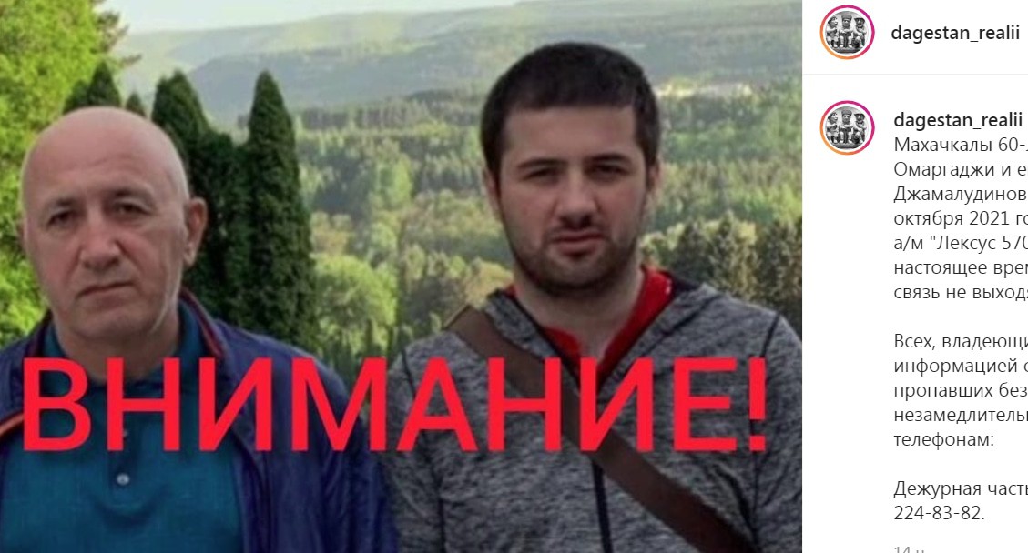 "Пропали двое жителей Махачкалы - 60-летний Омаргаджи Джамалудинов и его 29-летний сын Ахмед Джамалудинов, которые 2 октября выехали из дома на автомобиле Lexus LX570 белого цвета и по настоящее время не вернулись. На связь не выходят", - сообщила 3 октября пресс-служба МВД Дагестана на своей странице в Instagram.