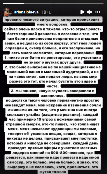 "Никто этот баттл не репетировал, его участники не знают о шутках друг друга. Это было выложено не по нашей инициативе на маленький канал с маленькой аудиторией, а не на "весь мир", как подают люди, на весь мир разнёс это тот, кто начал бустить (раскручивать, – прим. "Кавказского узла") это видео в инсте. Мы поняли, какую глупость совершили, и извинились", – написала Ариана Лолаева.