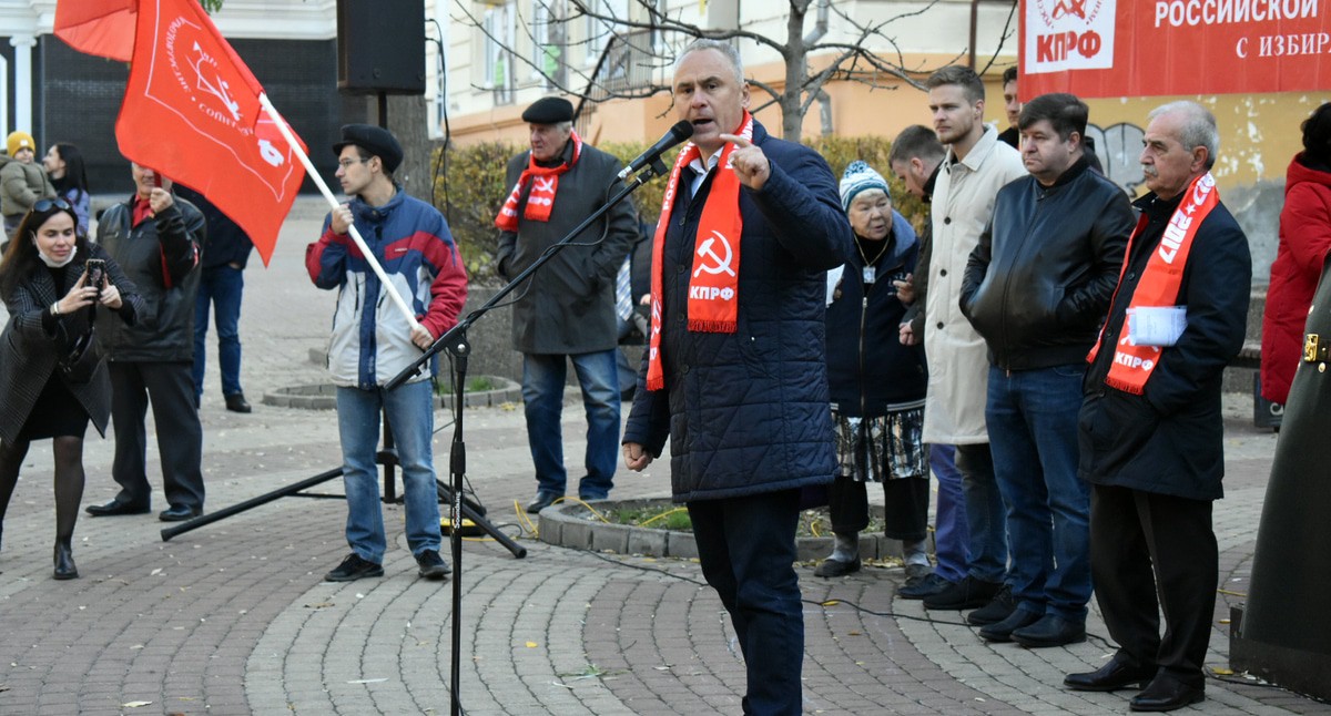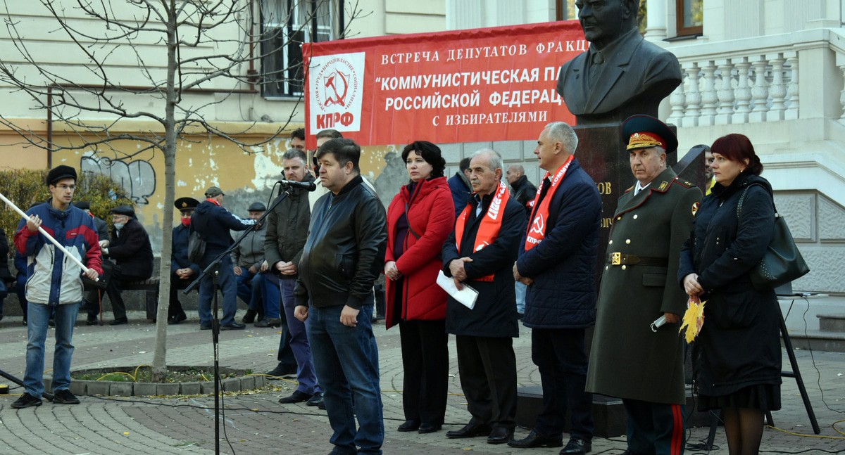 Сегодня в Ростове-на-Дону перед зданием научной библиотеки Южного федерального университета прошла встреча избирателей с депутатом Госдумы от КПРФ Евгением Бессоновым. На встречу, приуроченную к годовщине Октябрьской революции, собрались несколько десятков человек, в основном представители КПРФ и движения "За новый социализм". В руках у участников встречи не было плакатов и транспарантов, только флаги этих организаций и шарфы и маски с советской символикой, передал корреспондент "Кавказского узла", побывавший на месте акции.