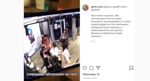 Видеозапись инцидента, сделанная камерами наблюдения, опубликована сегодня в Instagram-аккаунте сочинского фудкорта "Гастропорт". "Нам нечего скрывать. Мы выкладываем полное видео инцидента, произошедшего в стенах нашего фудмолла. Все имеющиеся материалы были переданы в правоохранительные органы", - говорится в аннотации к видео.