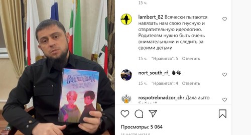 "Записываю очередное видеообращение к жителям Чеченской Республики, в первую очередь к родителям с тем, чтобы призвать их к бдительности, более внимательному отношению к воспитанию подрастающего поколения в плане духовно-нравственного воспитания молодежи. Нам стало известно, что на территории Чеченской Республики предпринимают попытки продажи, распространения данной книжной продукции", – заявил Ахмедов на кадрах видеоролика.