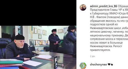 Видеообращение к губернатору ХМАО-Югра Наталье Комаровой и руководству силовых структур округа представитель главы Чечни в этом регионе, руководитель общественной организации "Национально-культурный центр чечено-ингушского народа" Адлан Орзалиев опубликовал 28 ноября на странице представительства в Instagram.