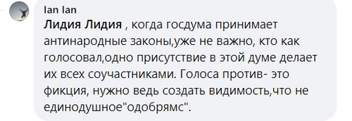 "Не важно, кто как голосовал, одно присутствие в этой думе делает их всех соучастниками. Голоса против – это фикция, нужно ведь создать видимость, что не единодушное "одобрям-с", – ответила ей Ian Ian.