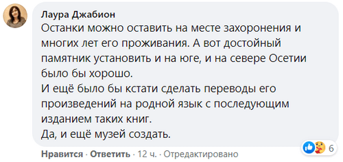 "Человек похоронен там, где жил и умер. Спустя столько лет, наверное, не нужно его перевозить в Осетию, если об этом не просил ни он, ни его родные. Лучше помогайте живым. А усопшими гордитесь, если они того заслужили!" - написал biragon.