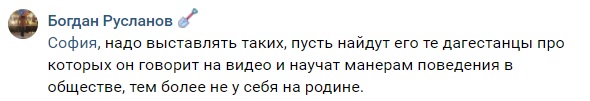 "Надо выставлять таких, пусть найдут его те дагестанцы, про которых он говорит на видео, и научат манерам поведения в обществе, тем более не у себя на родине", - считает Богдан Русланов. "Пускай стыдно будет ему за свой поступок, когда приедет на родину и посмотрит своим родителям в глаза", - заметил Арсен Магомедов.