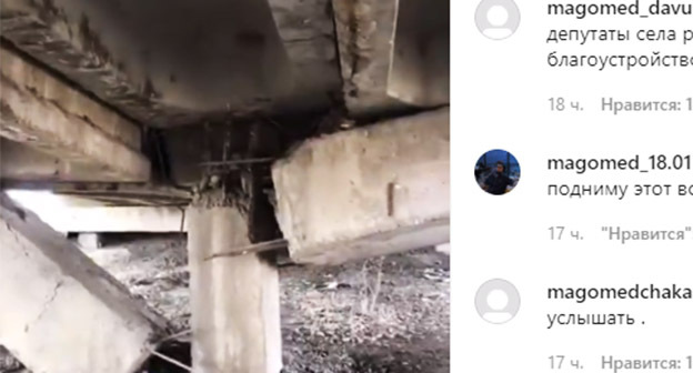 Ролик, на кадрах которого показан ветхий мост в селе Унхада, также был размещен сегодня в Instagram-паблике dagizvestiyaa, на который подписаны около 357 тысяч пользователей. К 14.00 мск эта публикация набрала около 15,5 тысячи просмотров и 60 комментариев.
