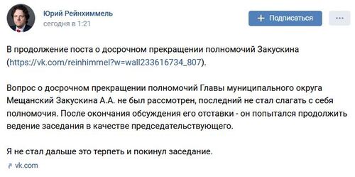 "Вопрос о досрочном прекращении полномочий главы муниципального округа Мещанский Закускина А.А. не был рассмотрен, последний не стал слагать с себя полномочия. После окончания обсуждения его отставки он попытался продолжить ведение заседания в качестве председательствующего. Я не стал дальше это терпеть и покинул заседание", - написал Рейнхиммель.