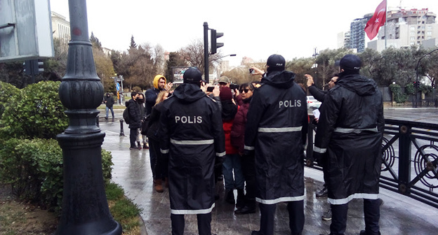 Участники акции "Линия защита" возле посольства России в Баку. 4 марта 2022 г. Фото Кямала Али для "Кавказского узлаСегодня "Линия защиты" намеревалась провести у посольства России акцию протеста в связи с нарушением прав человека на территории Украины, однако полиция преградила дорогу демонстрантам, объяснив это требованиями безопасности, сообщил корреспондент "Кавказского узла".