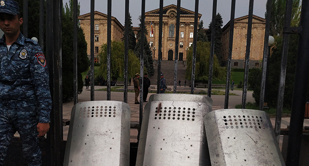 Сотрудники полиции во время акции. Ереван, 4 мая 2022 г. Фото Армине Мартиросян для "Кавказского узла"Как сообщал "Кавказский узел", с 25 апреля в Армении оппозиция проводит акции протеста с требованием об отставке премьер-министра Никола Пашиняна после того, как тот заявил о готовности "снизить планку" по карабахскому вопросу. 3 мая активисты объявили о проведении в Ереване акций неповиновения. Сегодня утром эти акции продолжились. Протестующие перекрыли грузовиками Киевский мост, а силовики стали задерживать участников протестов. К 14.00 [13.00 мск] за неповиновение полиции было задержано 40 активистов. Служба нацбезопасности Армении заявила о готовящемся штурме здания правительства Армении.
