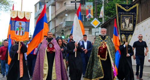 Вместе с крестным ходом шли участники акции "Бессмертный полк". Они несли портреты участников Великой Отечественной войны и карабахских войн.