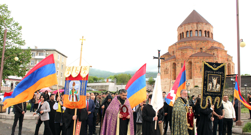 После церковной службы начался крестный ход от собора до Мемориального комплекса. Во главе крестного хода священнослужители Арцахской епархии Армянской апостольской церкви несли крест хранителя армянской армии царя Ашота Ерката (Железного) и покровителя Армии обороны Нагорного Карабаха Святого Григориса Хачвара. За священнослужителями следовали жители. На Мемориальном комплексе состоялось возложение цветов и венков к памятникам и могилам участникам ВОВ и карабахских войн.
